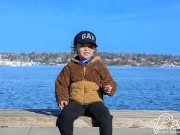 Young child in a brown jacket and blue GAP cap by the water.