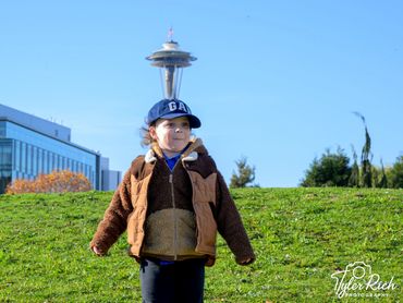 A young child in a brown jacket and GAP hat sits on an orange bench with the Space Needle in the background.